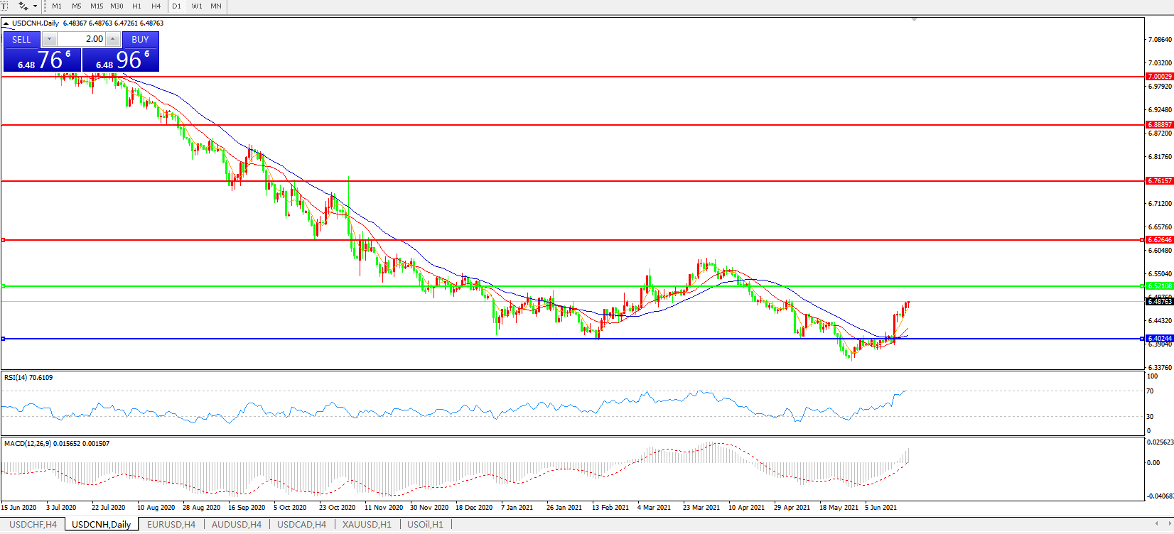 备选策略: 在6.5200之上,看涨,目标价位为6.6270,然后为6.7615。