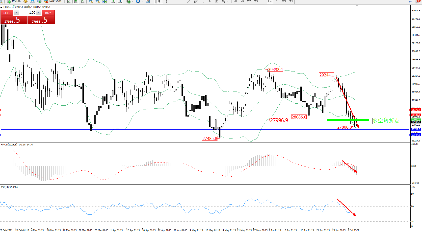 技术点评:高位空头动力急速下挫至布林带指标下轨附近持续震荡向下移动,跌势未见止步迹象,布林带指标呈张口走势持续中,MACD指标空头动力处于0轴线下方空头区域维持整理下行中,RSI指标处于50均衡线下方空头区域持续下探中;