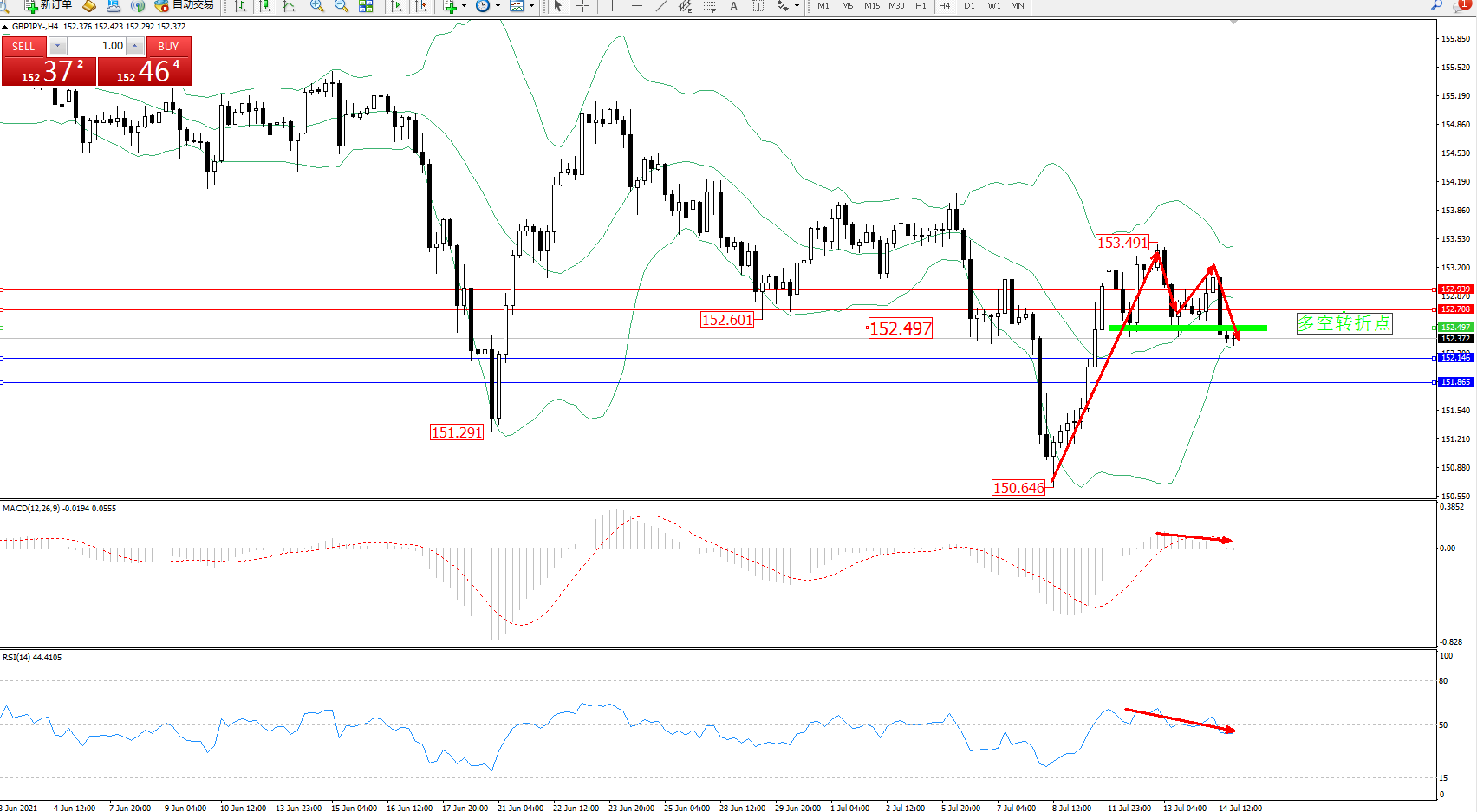 交易策略:152.497下方看跌,目标152.146、151.865