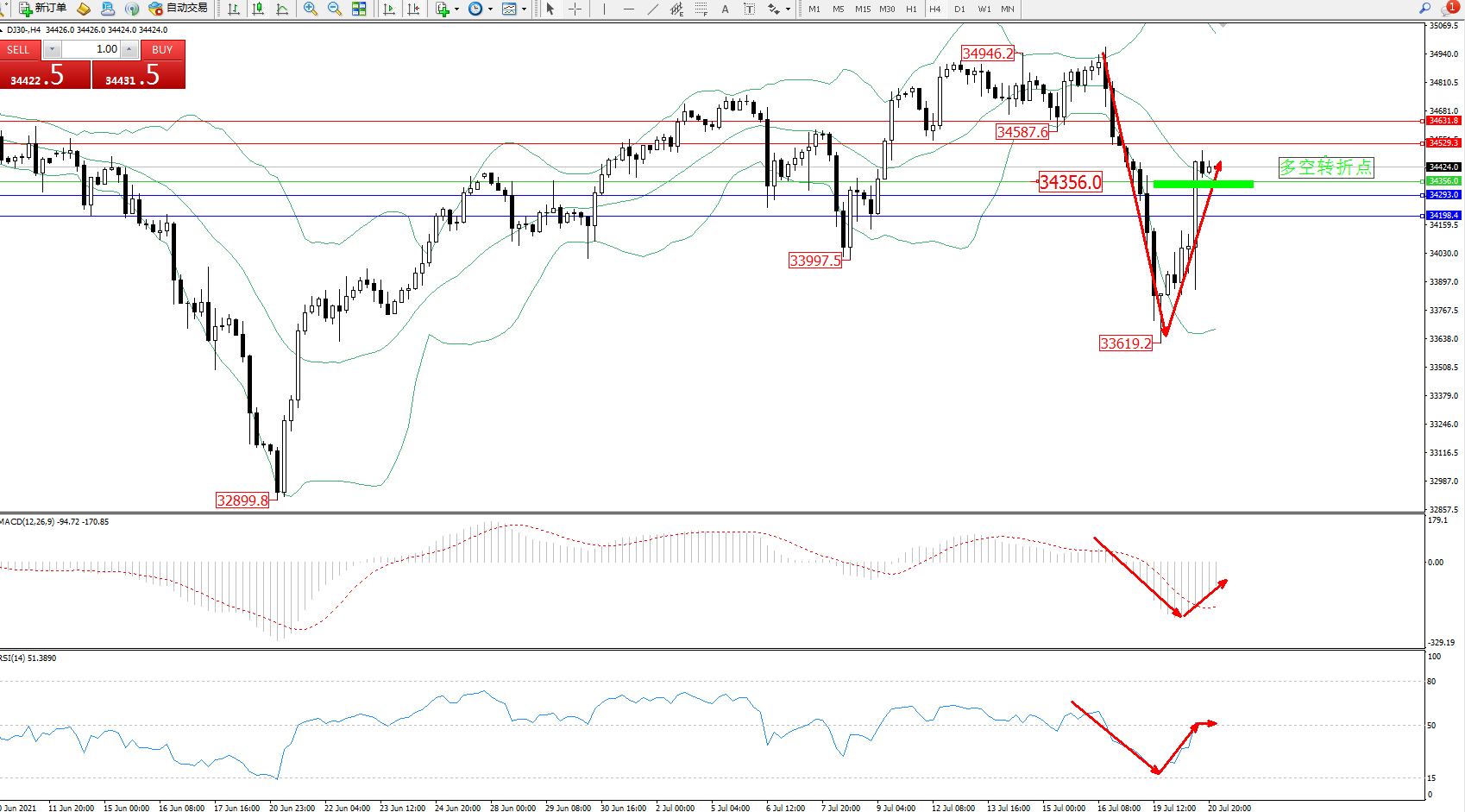 道琼斯指数DJ30——4小时K线图显示: