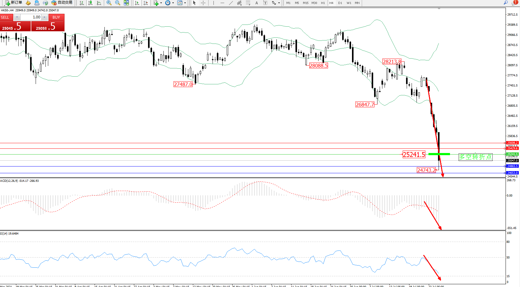 恒指HK50 ——4小时K线图显示: