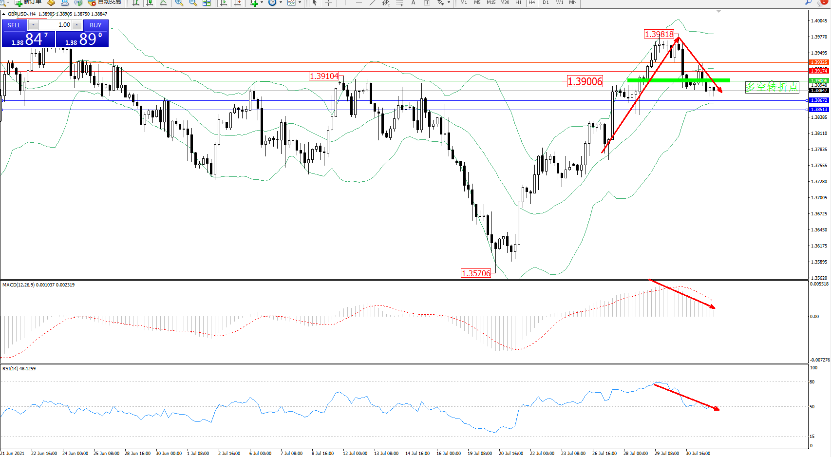 交易策略:1.39006下方看跌,目标1.38672、1.38513