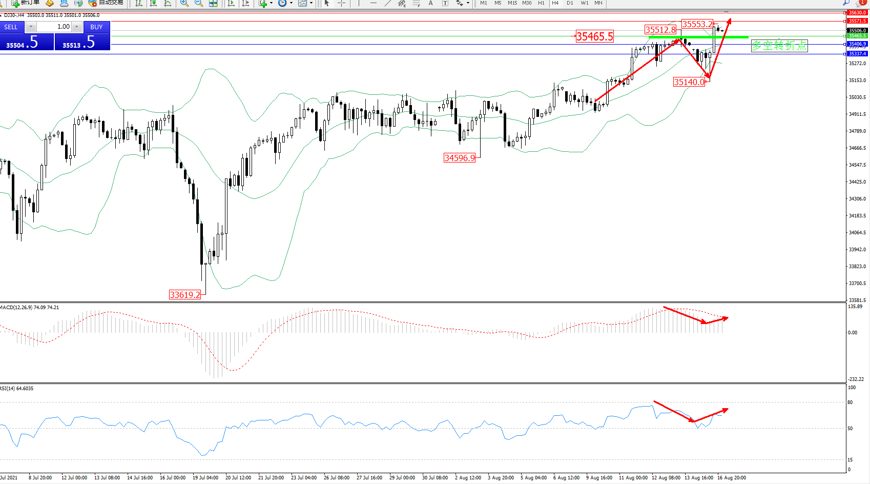 技术点评:多头动力延续布林带指标通道中上轨区间持续震荡上扬,高位抵达35512位置后出现整理回撤,短暂抵达35140位置得到支撑再度急速拉升,多头上行趋势态势良好,布林带指标呈收口走势后开始有张口迹象,MACD指标处于多头区域持续震荡中,RSI指标处于多头区域维持整理上移;