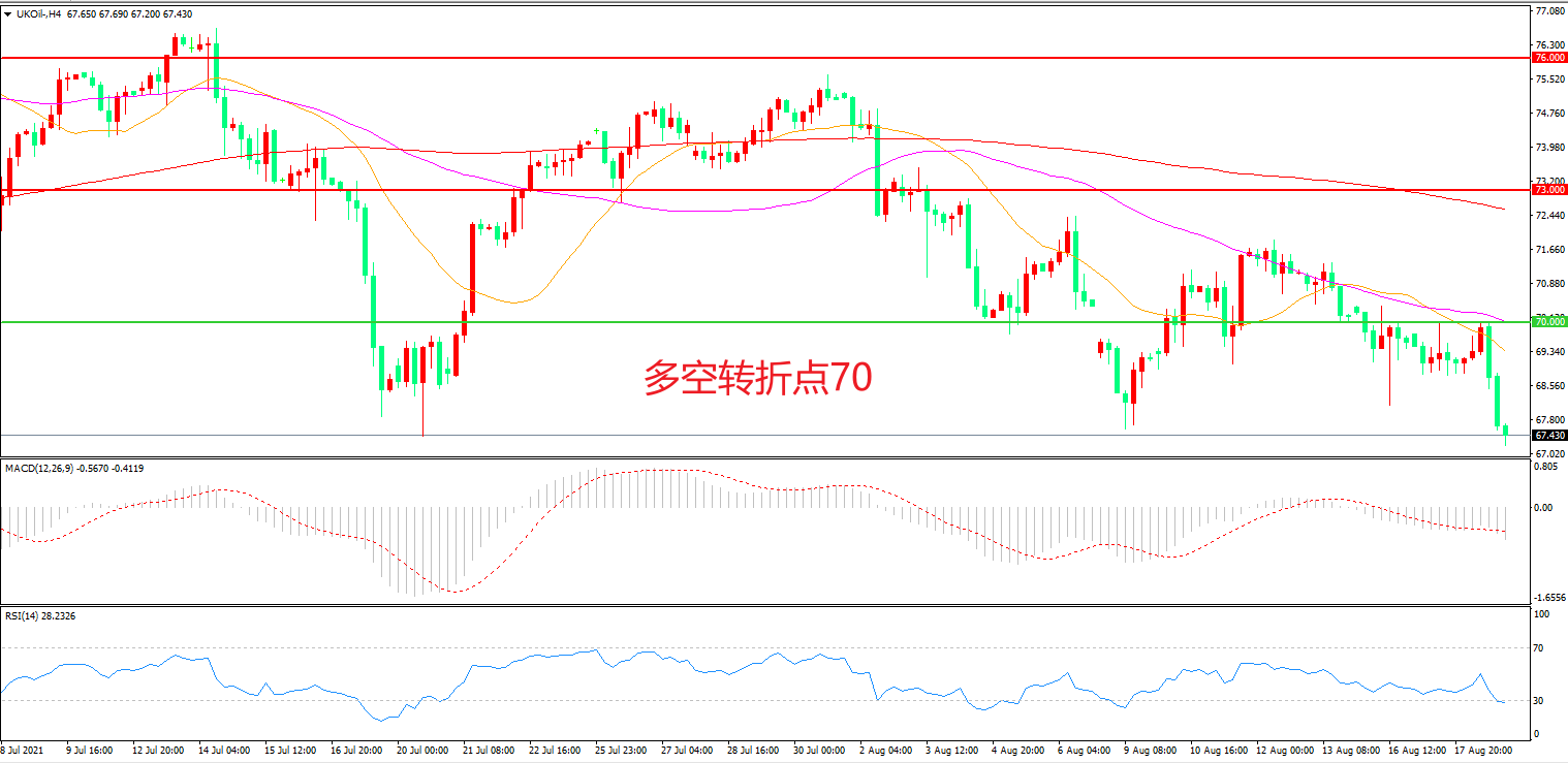 4小时图看,油价短线反弹后受制于55周期均线,70成为多空分水岭,短线行情较为低迷,MACD红柱减少,RSI指标走平,油价震荡下行概率较大。