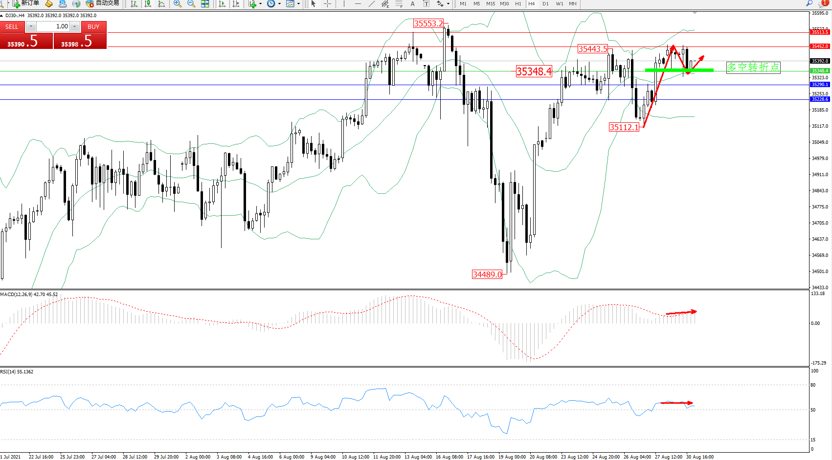 道琼斯指数DJ30——4小时K线图显示: