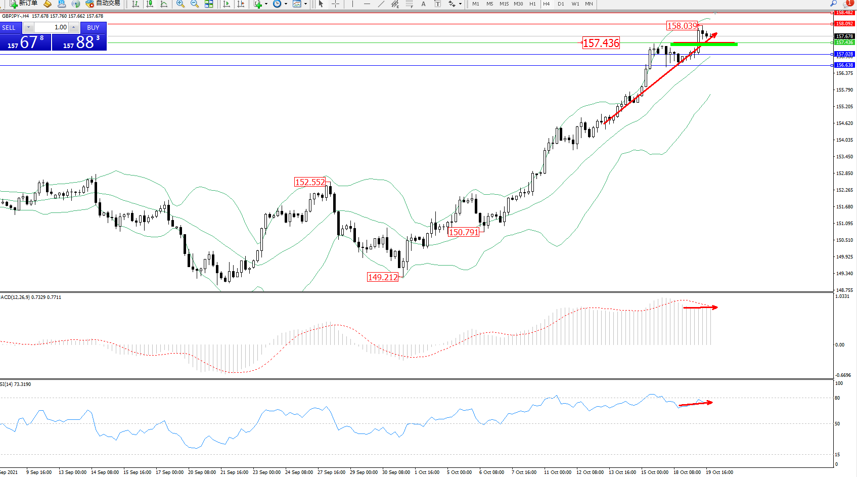 交易策略:157.436上方看涨,目标158.092、158.482