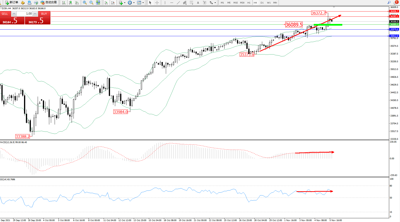 技术点评:多头动力延续布林带指标通道中上轨区间持续震荡上扬,高位抵达36372位置节点后开始整理,短期多头动力有进一步向上移动态势,布林带指标呈平缓上移走势中,MACD指标处于多头区域维持整理平移,RSI指标处于多头区域持续徘徊中;