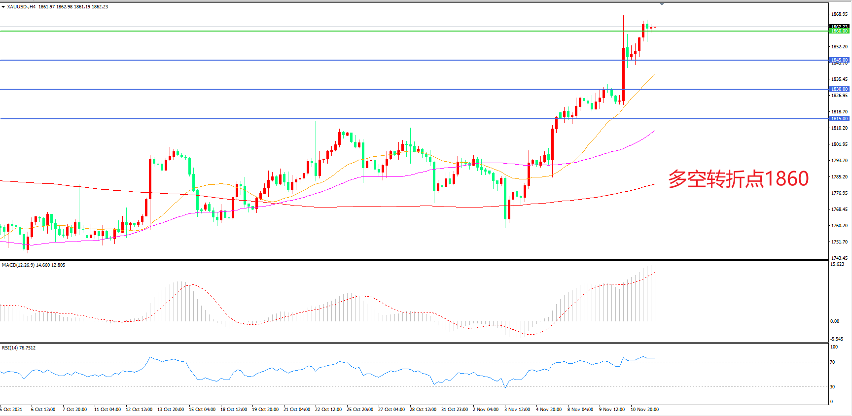 4小时图看,金价阳线连续拉升,短期走势偏强,1860一线被突破,1845成为下方支撑,MACD红柱增加,RSI指标走平,日内震荡上行概率较大。
