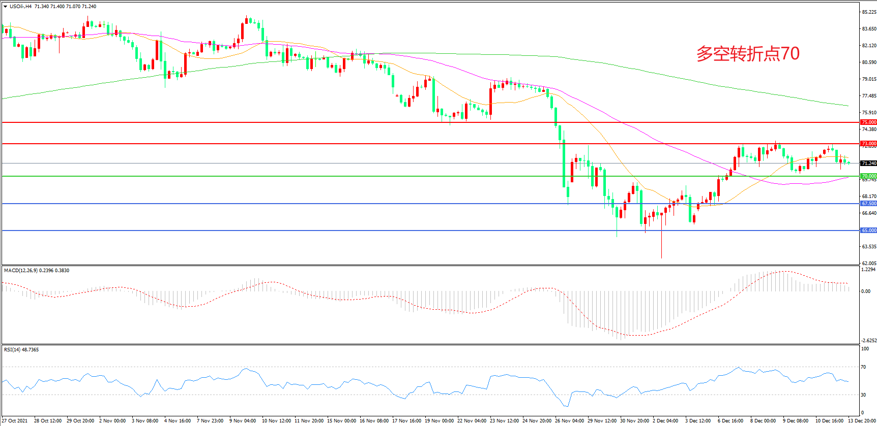 4小时图看,油价延续高位调整,区间震荡继续明显,70美元成为下方支撑,73美元成为上方阻力,MACD红柱缩短,RSI指标走平,日内延续震荡概率较大。