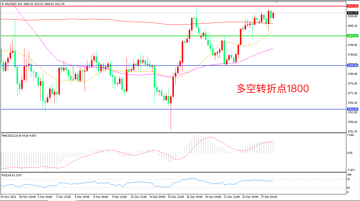 周一(12月27日),本周仍处于年末节假日的交投清淡期,投资者持续评估奥密克戎传播及其对经济前景和货币政策的影响,金价延续近期强势表现,收报1811.70美元/盎司。目前市场首次完全计价入2022年5月将迎来美联储在疫情后的首次加息,美元后市能否走低,将是决定本周金价冲破阻力位的关键。