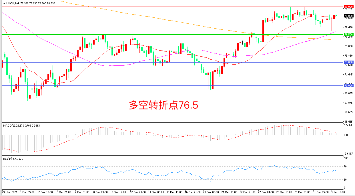 交易策略:在76.50之上看涨,目标80. 00              83.00