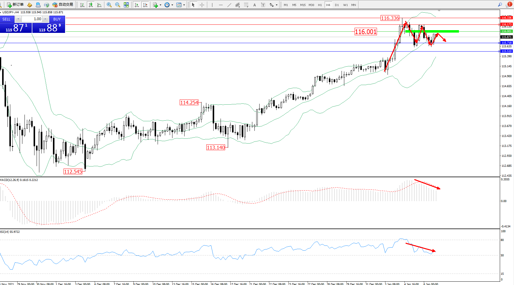交易策略:116.001下方看跌,目标115.718、115.510