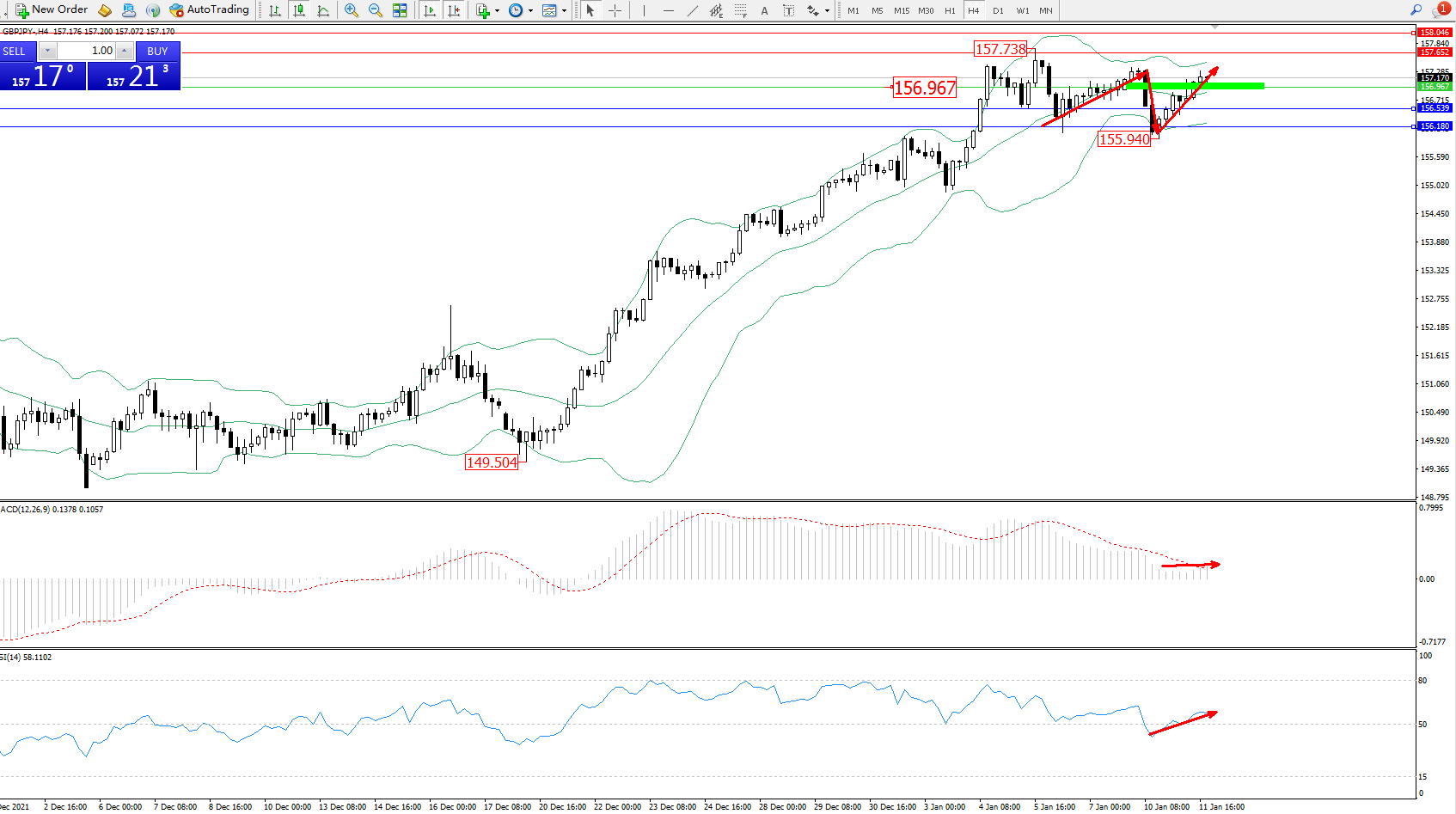 备选策略:156.967下方看跌,目标156.539、156.180