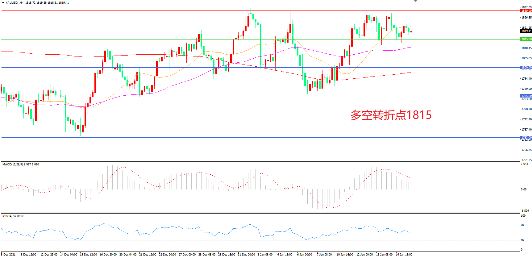 4小时图看,金价突破1815后陷入震荡,短期方向并不明确,1815成为多空分水岭, MACD红柱缩短,RSI指标走平,日内延续震荡概率较大。
