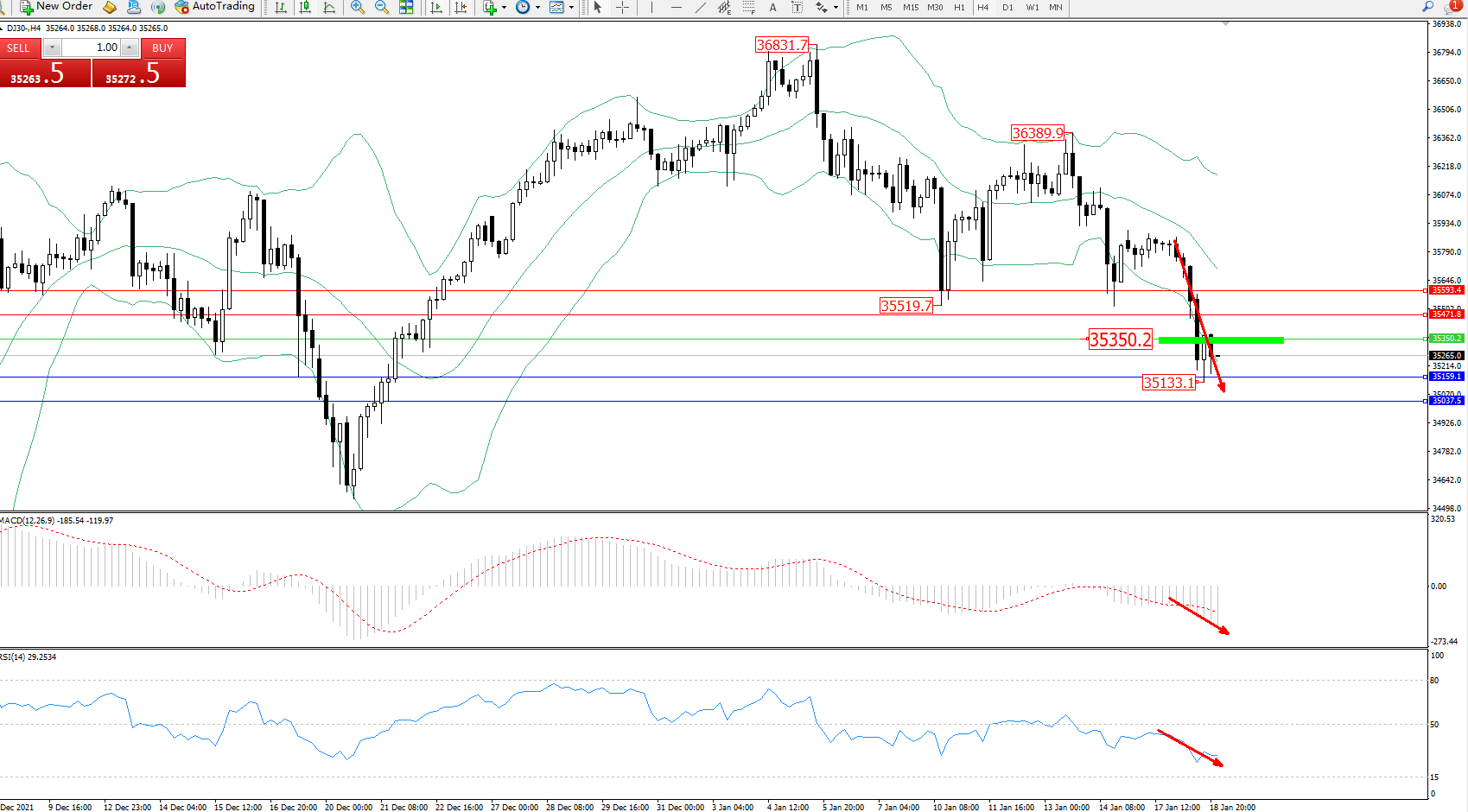 技术点评:空头动力延续布林带指标下轨附近节点不断震荡下行,短期抵达35133位置后得到短暂支撑开始震荡,但下行趋势尚未有止步迹象,布林带指标呈向下移动趋势不断震荡下行,MACD指标处于空头区域维持震荡下行中,RSI指标处于空头区域维持弱势向下移动移动;