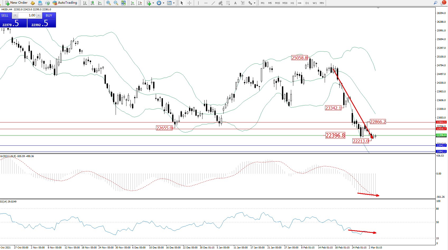 恒指HK50 ——4小时K线图显示: