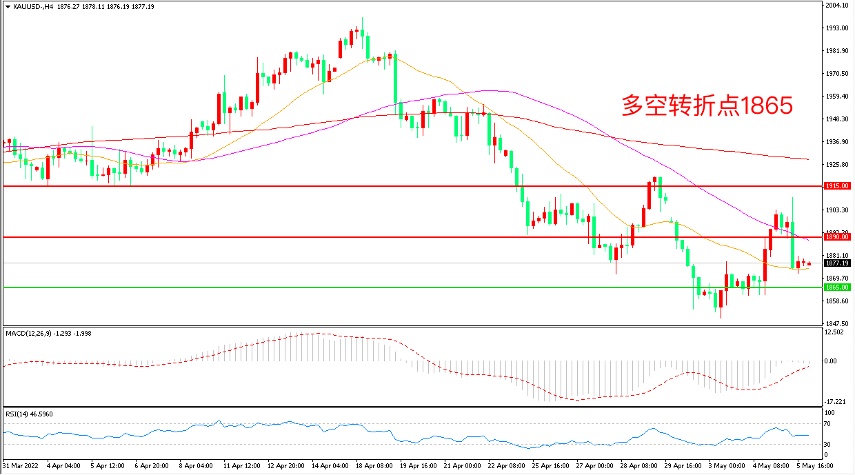 周四(5月5日),投资者持续消化美联储以22年来最大幅度加息和马上开启缩表的信息,美元指数刷新二十年高位上逼104,现货黄金承压回落,收报1877.84美元/盎司。随着美联储加速开启货币政策正常化进程,市场对黄金的投资偏好支撑逐步减弱,避险情绪退潮的背景下,重点关注本周五非农就业数据的表现。