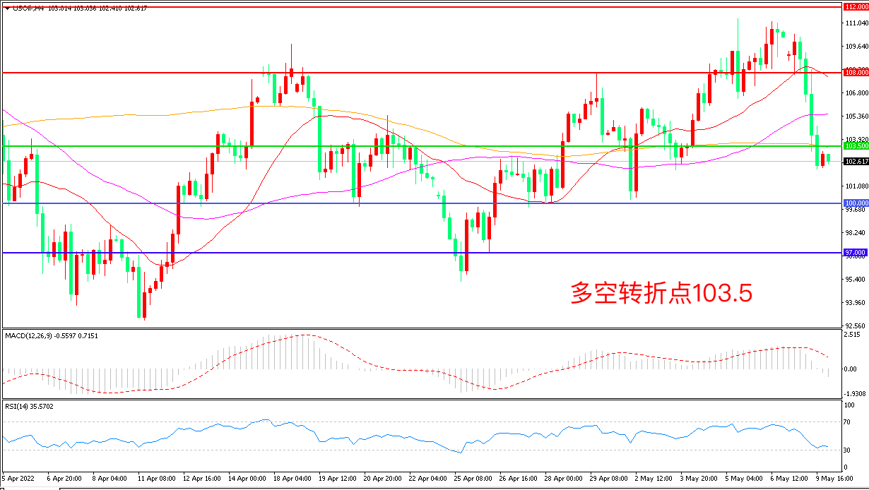 周一(5月9日),因担忧欧美央行持续收紧政策,全球经济衰退的担忧升温,风险资产遭遇惨烈抛售,美国WTI原油暴跌近8%,收报102.48美元/桶。目前为了控制通胀压力,欧美国家正在从市场中撤回流动性,宏观阴云笼罩市场,这已经成为市场最大的风险点,在市场情绪未稳定之前,油价接下来将有机会考验100整数大关以及区间下沿附近支撑。