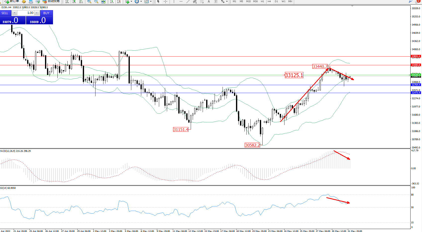 交易策略:33125下方看跌,目标32764、32475