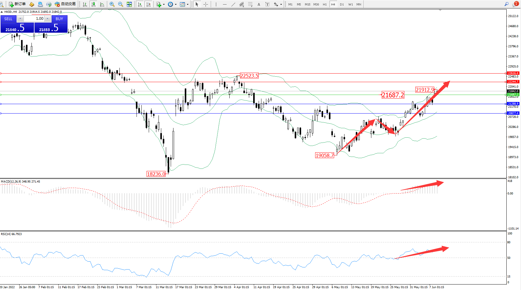 交易策略:21687上方看涨,目标22244、22616