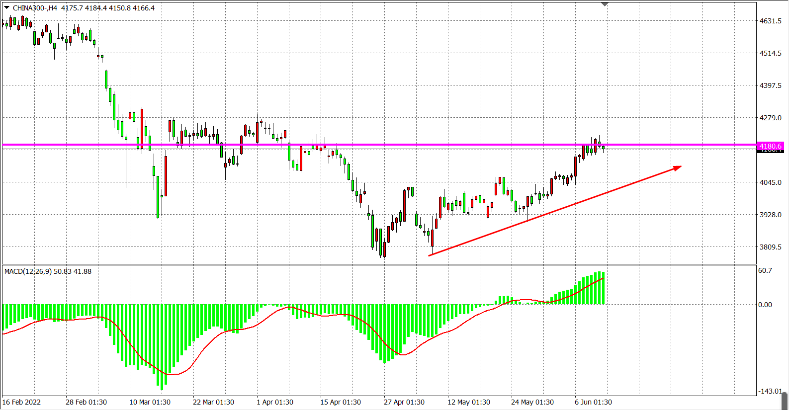 4小时图看,沪深300继续围绕4180来回震荡,最终小幅收跌于于4180之上,短期行情再度陷入震荡,但趋势仍是上升为主,MACD柱体于零轴之上不断放大,显示多头动能仍旧强劲,回调过后仍有望重拾涨势