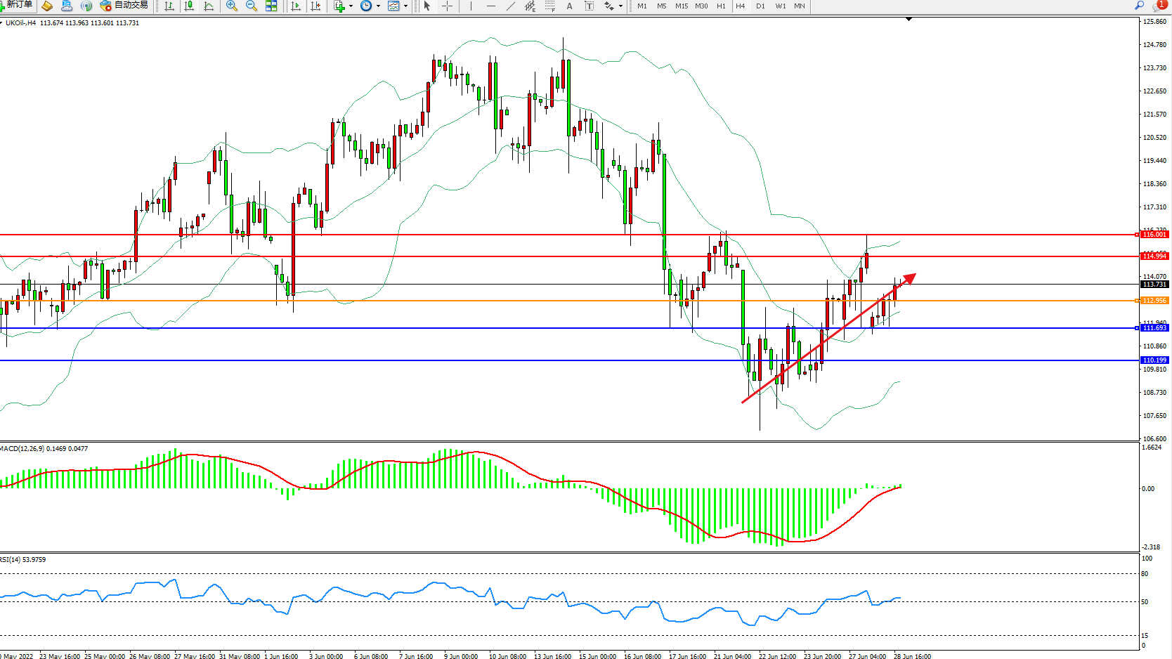 交易策略:112.956上方看涨,目标114.994、116.001