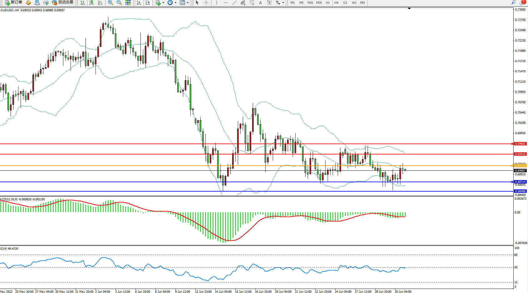 交易策略:0.69123下方看跌,目标0.68714、0.68488