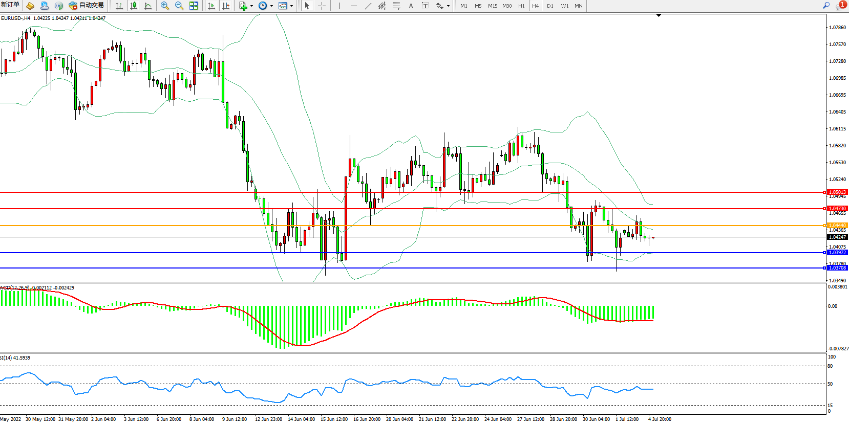 4小时图看:空头动力延续布林带指标通道中下轨区间持续震荡下行,布林带指标呈收口走势持续中,波幅空间逐渐收窄,MACD指标处于0轴线下侧震荡平移,RSI指标处于50均衡线下侧窄幅整理平移;