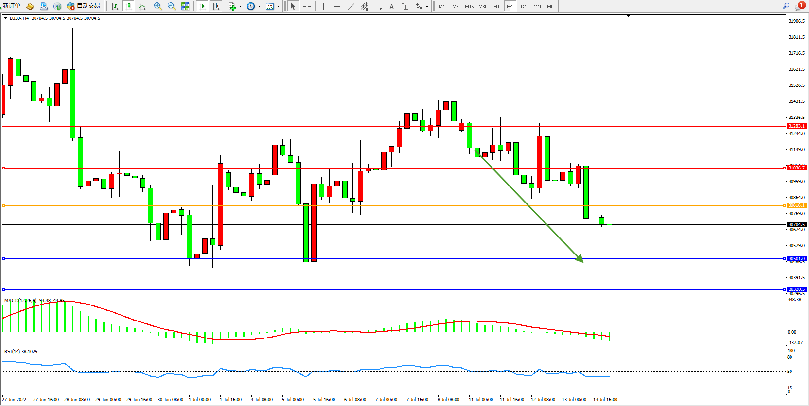 道琼斯指数DJ30——4小时K线图显示: