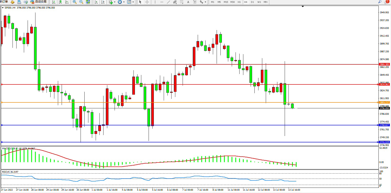 标普SP500——4小时K线图显示: