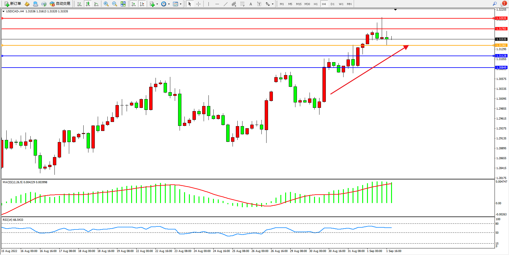 美元加元USDCAD——4小时K线图显示: