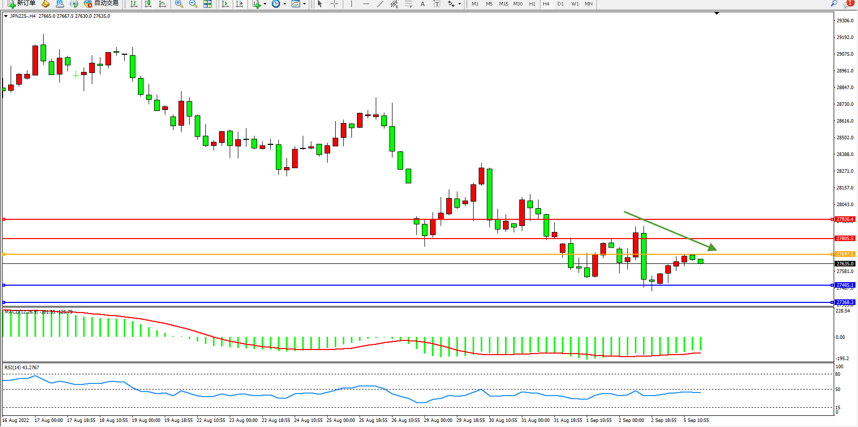 日经225指数9月5日(周一)收盘下跌24.34点,跌幅0.09%,报27626.50点。日本8月Markit服务业PMI录得49.5,高于前值的49.2,但仍处于收缩区间;市场定价美联储终端利率较高,日本央行可能按兵不动。