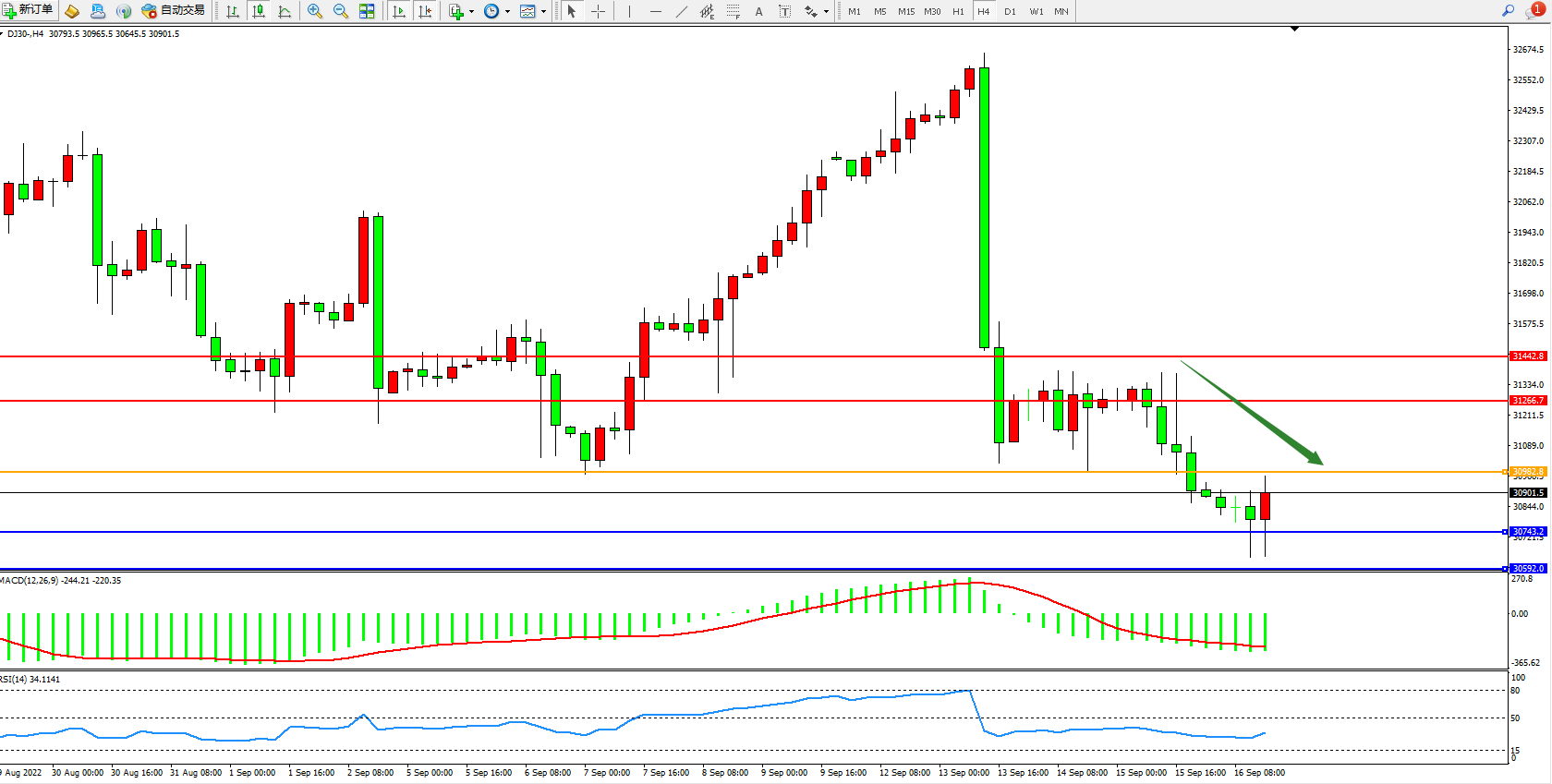 道琼斯指数DJ30——4小时K线图显示: