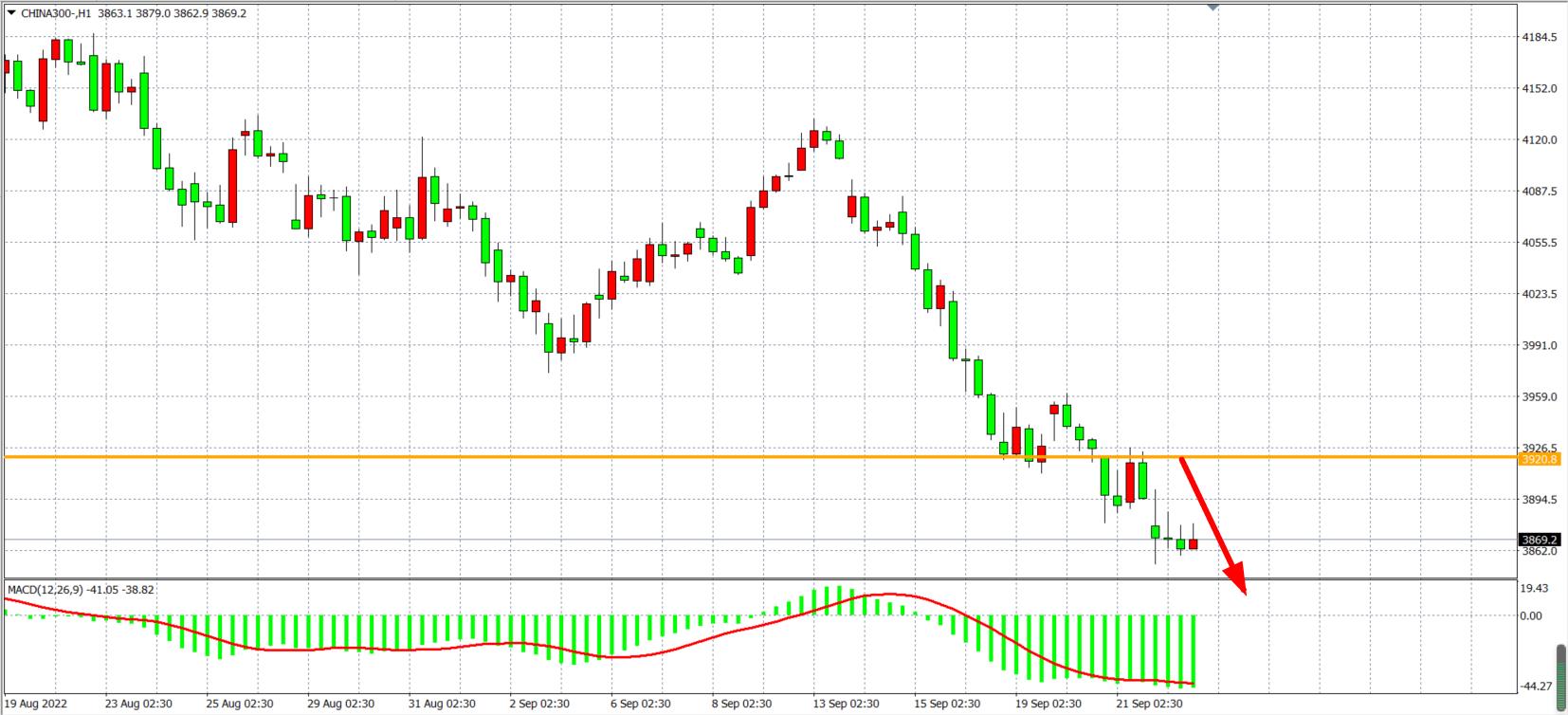 1小时图看,沪深300延续再3920之下的跌势,3同时MACD在零轴之下持续量能放大尚无缩量迹象,趋势延续空头下跌为主。