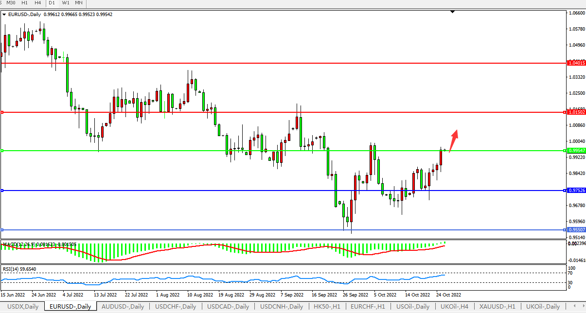 在周四的欧洲央行会议前,欧元升至20日高点。预计欧洲央行将在会议上加息75个基点,以控制高涨的通胀。欧元兑美元尾盘上涨0.87%,报0.99595美元。