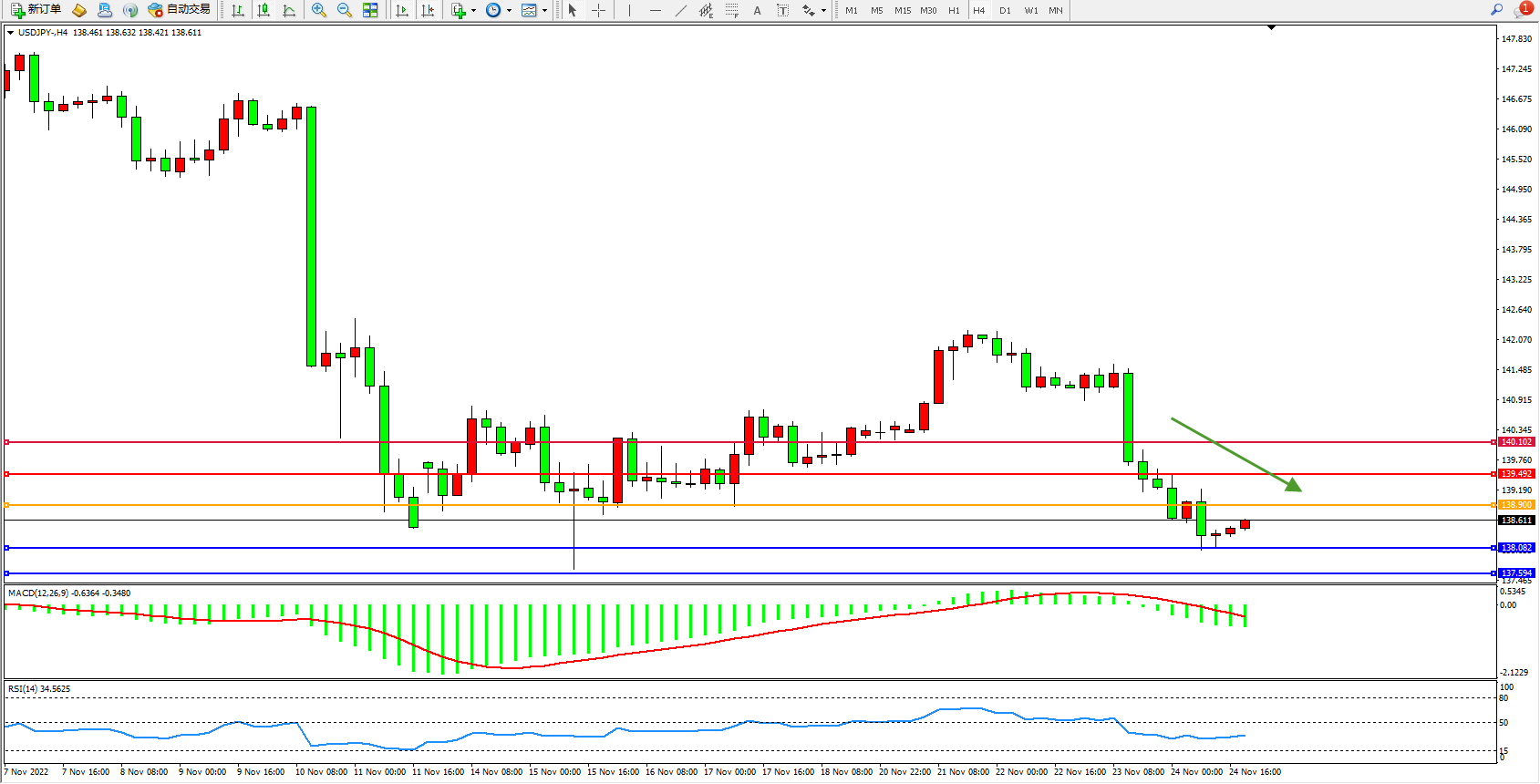 交易策略:138.900下方看跌,目标138.082、137.594