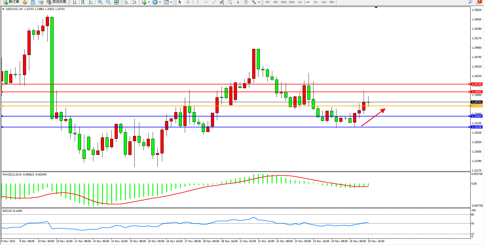 美元加元USDCAD——4小时K线图显示: