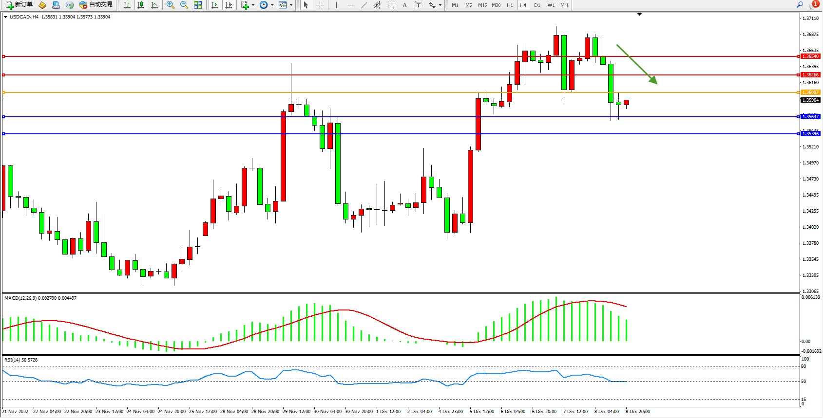 美元加元USDCAD——4小时K线图显示:
