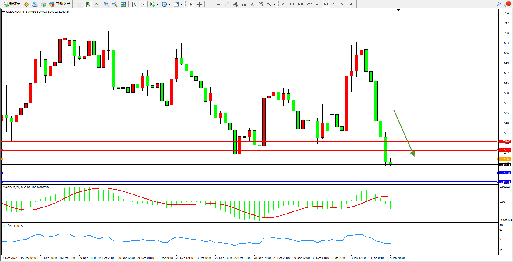 美元加元USDCAD——4小时K线图显示: