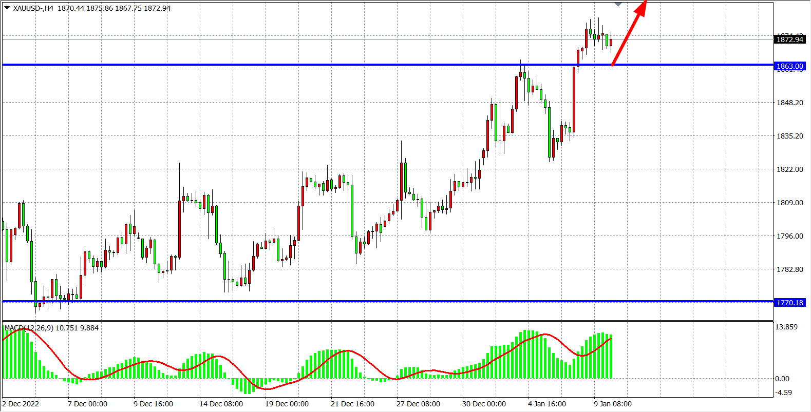 4小时图看,金价在上破1863之后持续走强,打开新一轮上行空间,目前阻力已转化为支撑,同时MACD量能在零轴之上持续大幅放量,显示行情维持强势多头走势,日内在1863之上继续看涨,上方目标看1900附近,破位看更高。