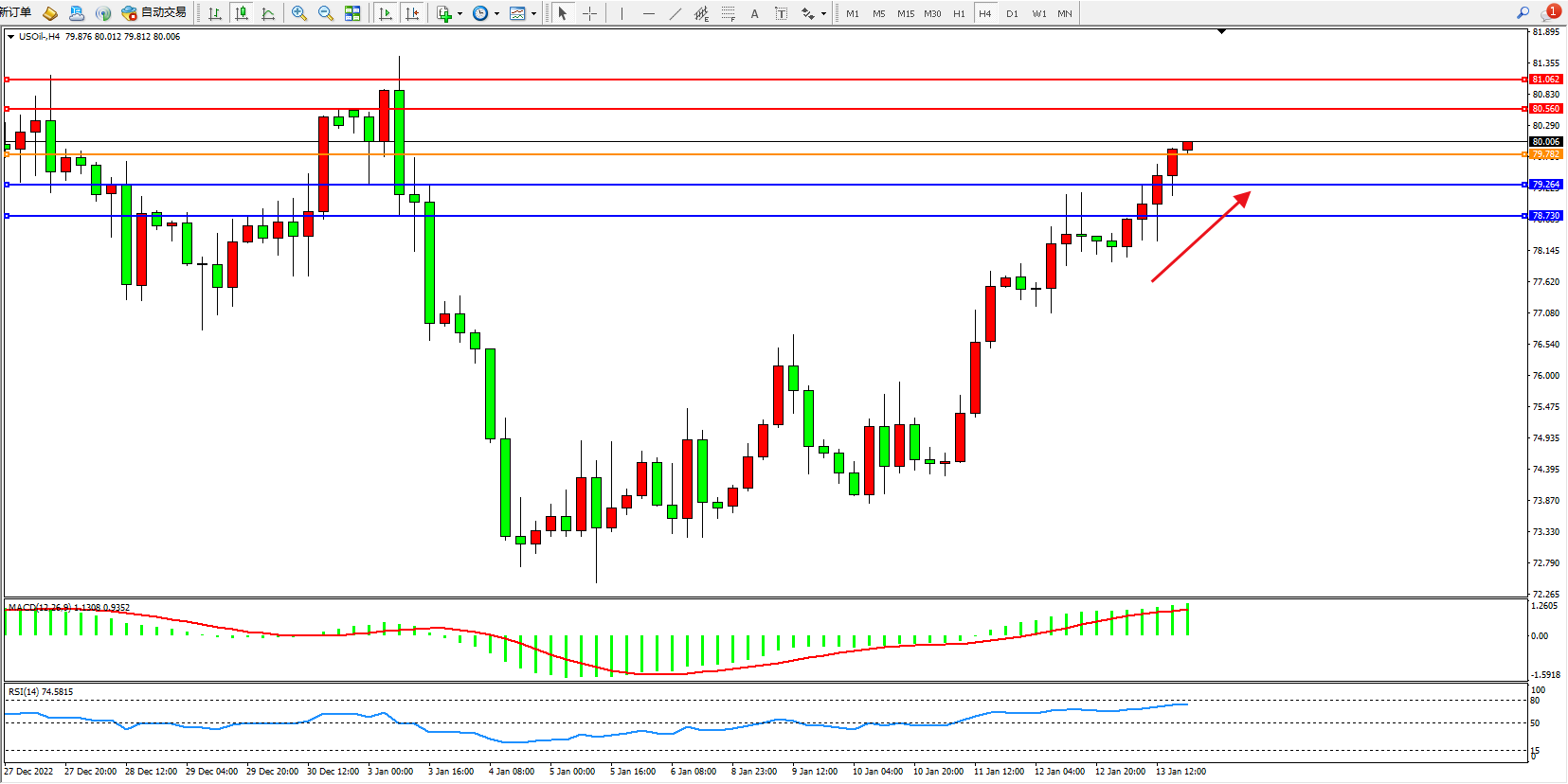 交易策略:79.782上方看涨,目标80.560、81.062
