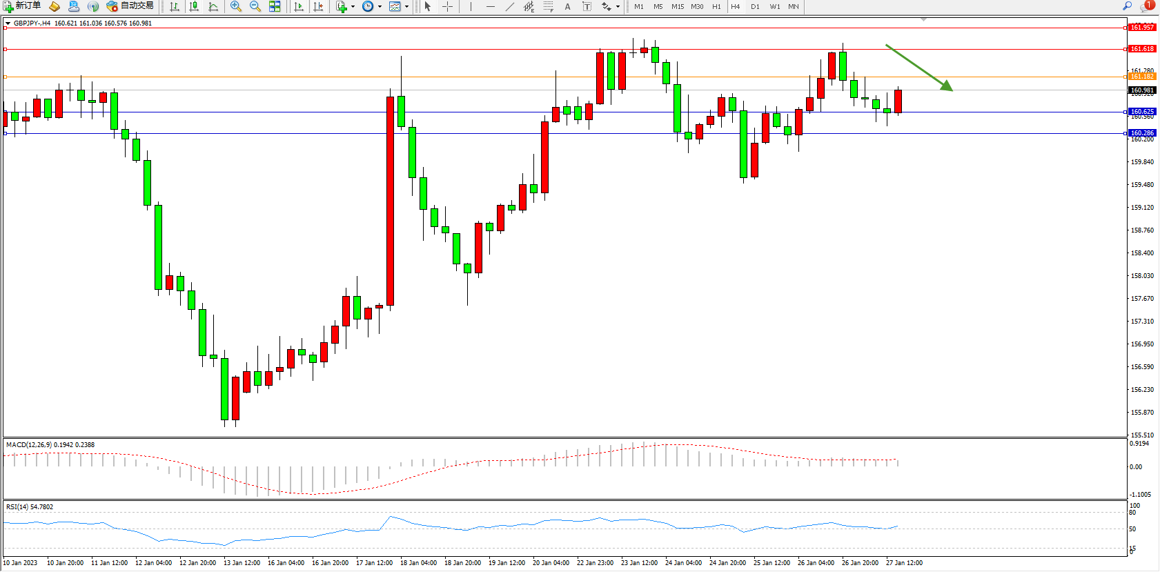 交易策略:161.182下方看跌,目标160.625、160.286