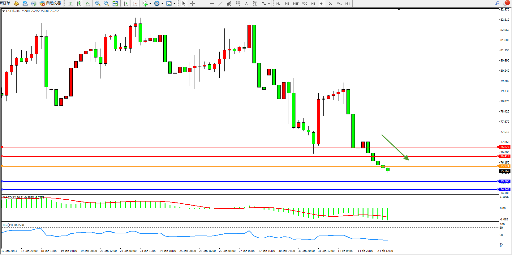 交易策略:75.974下方看跌,目标75.300、74.943