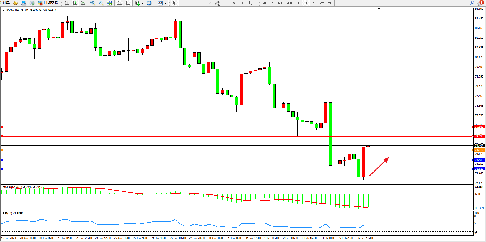 原油USOil——4小时K线图显示: