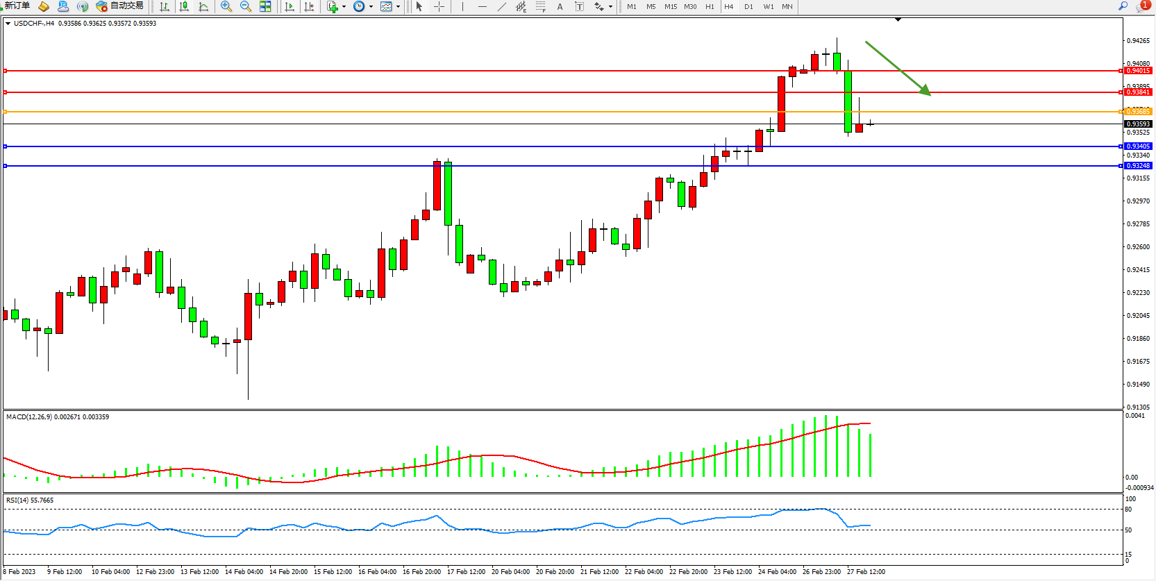 交易策略:0.93685下方看跌,目标0.93405、0.93248