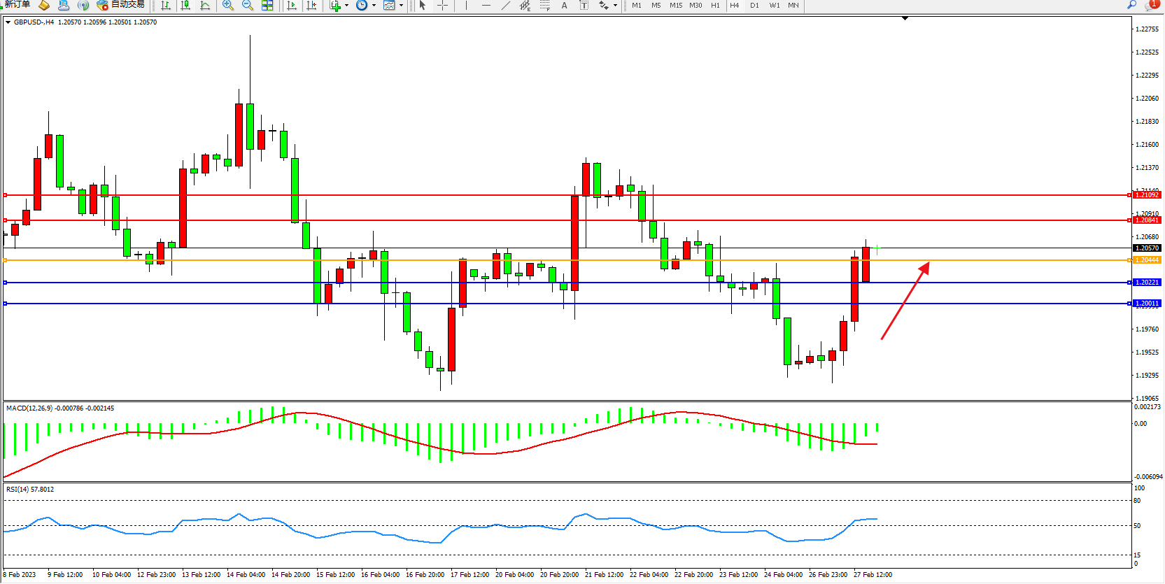 交易策略:1.20444上方看涨,目标1.20841、1.21092