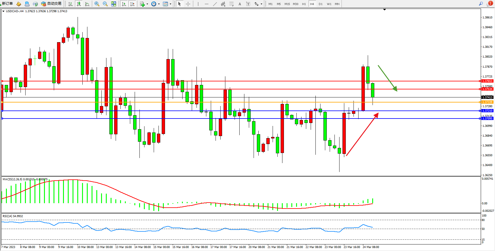 美元加元USDCAD——4小时K线图显示: