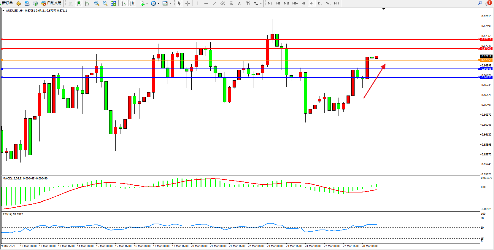 交易策略:0.67056上方看涨,目标0.67202 0.67318