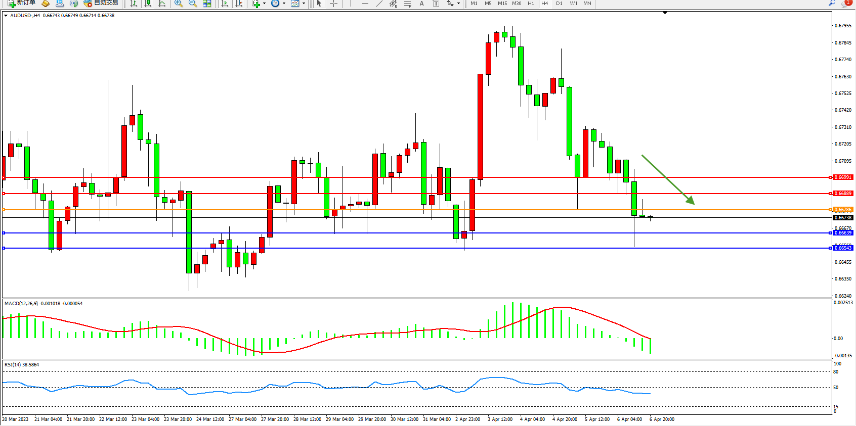 交易策略:0.66786下方看跌,目标0.66639 0.66543