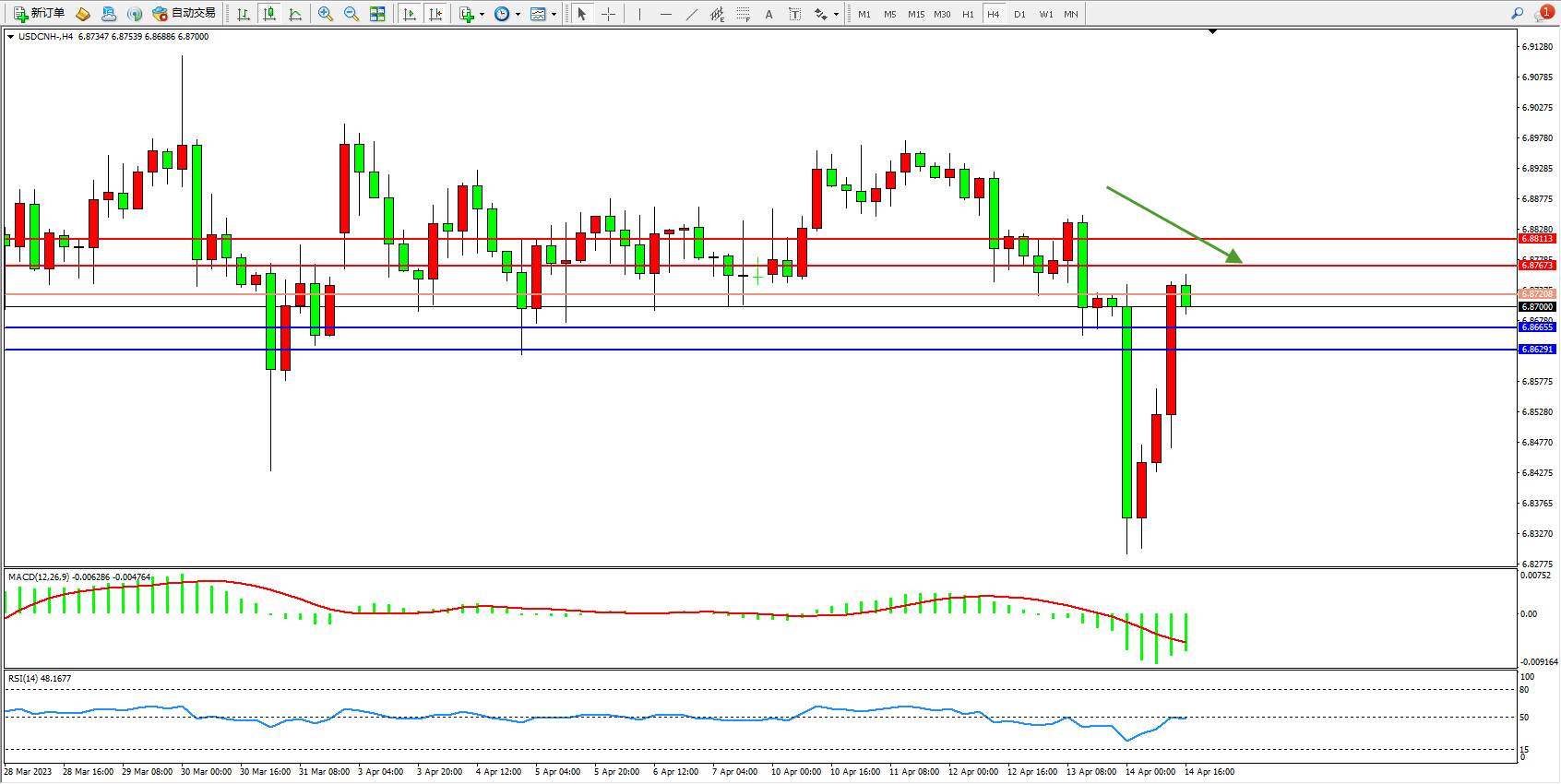 美元人民币USDCNH——4小时K线图显示: